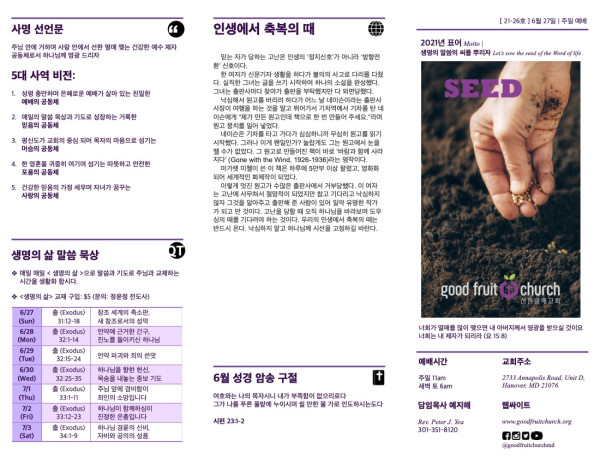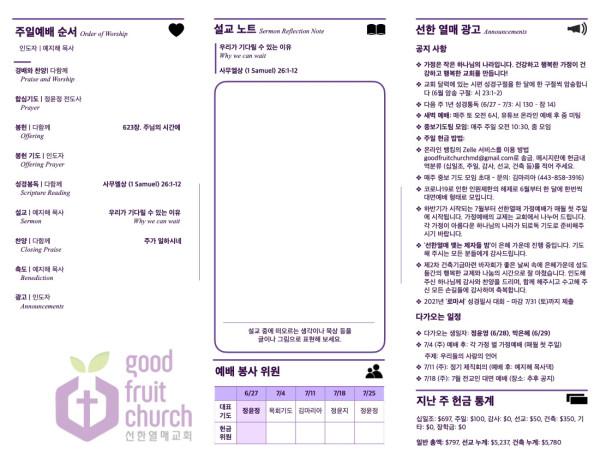 2021-06-27 페이지 정보 작성자 선한열매교회 댓글 0건 조회 3,597회 작성일 21-06-26 18:20 목록 본문 주일 예배 주보 이전글2021-07-04 21.07.09 다음글2021-06-20 21.06.20 댓글 0 댓글목록 등록된 댓글이 없습니다. 목록