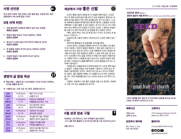 2021-06-06 페이지 정보 작성자 선한열매교회 댓글 0건 조회 3,640회 작성일 21-06-07 17:26 목록 본문 2021-06-06 주보 이전글2021-06-13 21.06.12 다음글2021-05-30 21.05.29 댓글 0 댓글목록 등록된 댓글이 없습니다. 목록