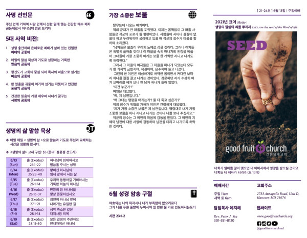 2021-06-13 페이지 정보 작성자 선한열매교회 댓글 0건 조회 3,645회 작성일 21-06-12 19:11 목록 본문 2021-06-13 주보 이전글2021-06-20 21.06.20 다음글2021-06-06 21.06.07 댓글 0 댓글목록 등록된 댓글이 없습니다. 목록