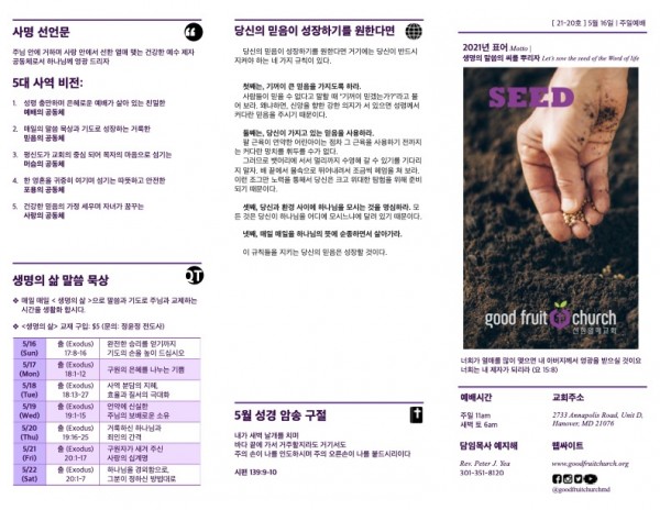 2021-05-16 페이지 정보 작성자 선한열매교회 댓글 0건 조회 3,606회 작성일 21-05-15 14:32 목록 본문 2021-05-16 주보 이전글2021-05-23 21.05.23 다음글2021-05-09 21.05.08 댓글 0 댓글목록 등록된 댓글이 없습니다. 목록