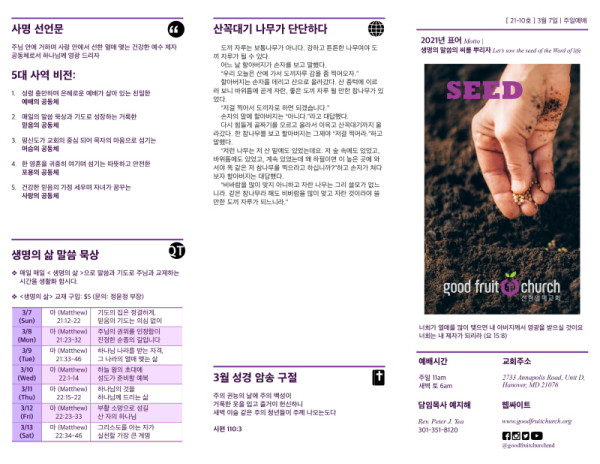 2021-03-07 페이지 정보 작성자 선한열매교회 댓글 0건 조회 3,098회 작성일 21-04-03 00:09 목록 본문 2021-03-07 이전글2021-03-14 21.04.03 다음글2021-02-28 21.04.03 댓글 0 댓글목록 등록된 댓글이 없습니다. 목록