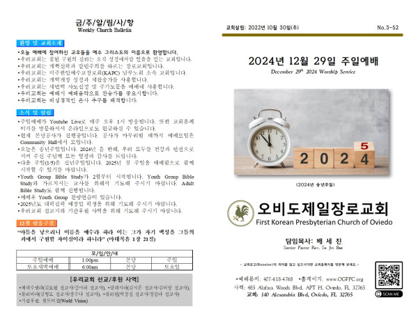 2024년 12월 29일 주일주보 페이지 정보 작성자 오비도제일장로교회 댓글 0건 조회 2,135회 작성일 25-01-02 18:03 목록 본문 2024년 12월 29일 주일주보입니다. 이전글2025년 1월 5일 주일주보 25.01.05 다음글2024년 12월 22일 주일주보 24.12.25 댓글 0 댓글목록 등록된 댓글이 없습니다. 목록