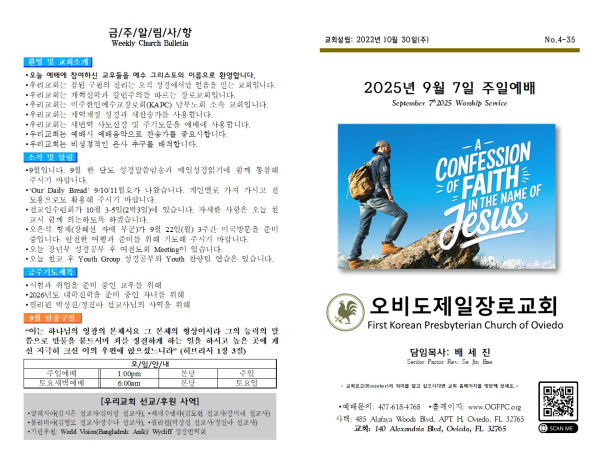 2025년 9월 7일 주일주보 페이지 정보 작성자 오비도제일장로교회 댓글 0건 조회 469회 작성일 25-09-11 17:49 목록 본문 2025년 9월 7일 주일주보입니다. 이전글2025년 9월 14일 주일주보 25.09.19 다음글2025년 8월 31일 주일주보 25.08.31 댓글 0 댓글목록 등록된 댓글이 없습니다. 목록