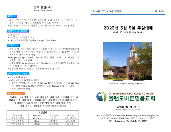 2023년 3월 5일 주일주보 페이지 정보 작성자 올랜도바른믿음교회 댓글 0건 조회 2,441회 작성일 23-03-11 13:57 목록 본문 2023년 3월 5일 주일주보입니다. 이전글2023년 3월 12일 주일주보 23.03.17 다음글2023년 2월 26일 주일주보 23.02.27 댓글 0 댓글목록 등록된 댓글이 없습니다. 목록