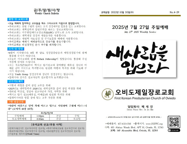 2025년 7월 27일 주일주보 페이지 정보 작성자 오비도제일장로교회 댓글 0건 조회 657회 작성일 25-07-27 13:49 목록 본문 2025년 7월 27일 주일주보입니다. 이전글2025년 8월 3일 주일주보 25.08.02 다음글2025년 7월 20일 주일주보 25.07.20 댓글 0 댓글목록 등록된 댓글이 없습니다. 목록