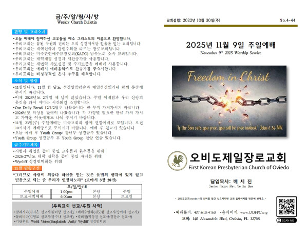2025년 11월 9일 주일주보 페이지 정보 작성자 오비도제일장로교회 댓글 0건 조회 196회 작성일 25-11-09 06:05 목록 본문 2025년 11월 9일 주일주보입니다. 이전글2025년 11월 16일 주일주보 25.11.16 다음글2025년 11월 2일 주일주보 25.11.02 댓글 0 댓글목록 등록된 댓글이 없습니다. 목록